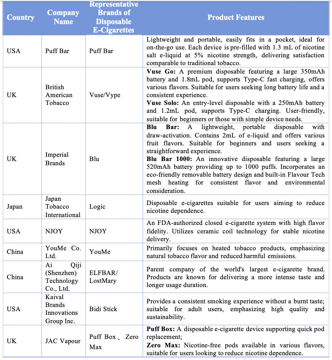 Currently, leading global disposable e-cigarette companies include British American Tobacco, Imperial Brands, Japan Tobacco International, Puff Bar, and Ai Qiji (Shenzhen) Technology Co., Ltd. These enterprises are primarily concentrated in the United States and the United Kingdom, while companies from China and Japan also hold notable positions in the global market. The representative companies and their products are summarized below.
