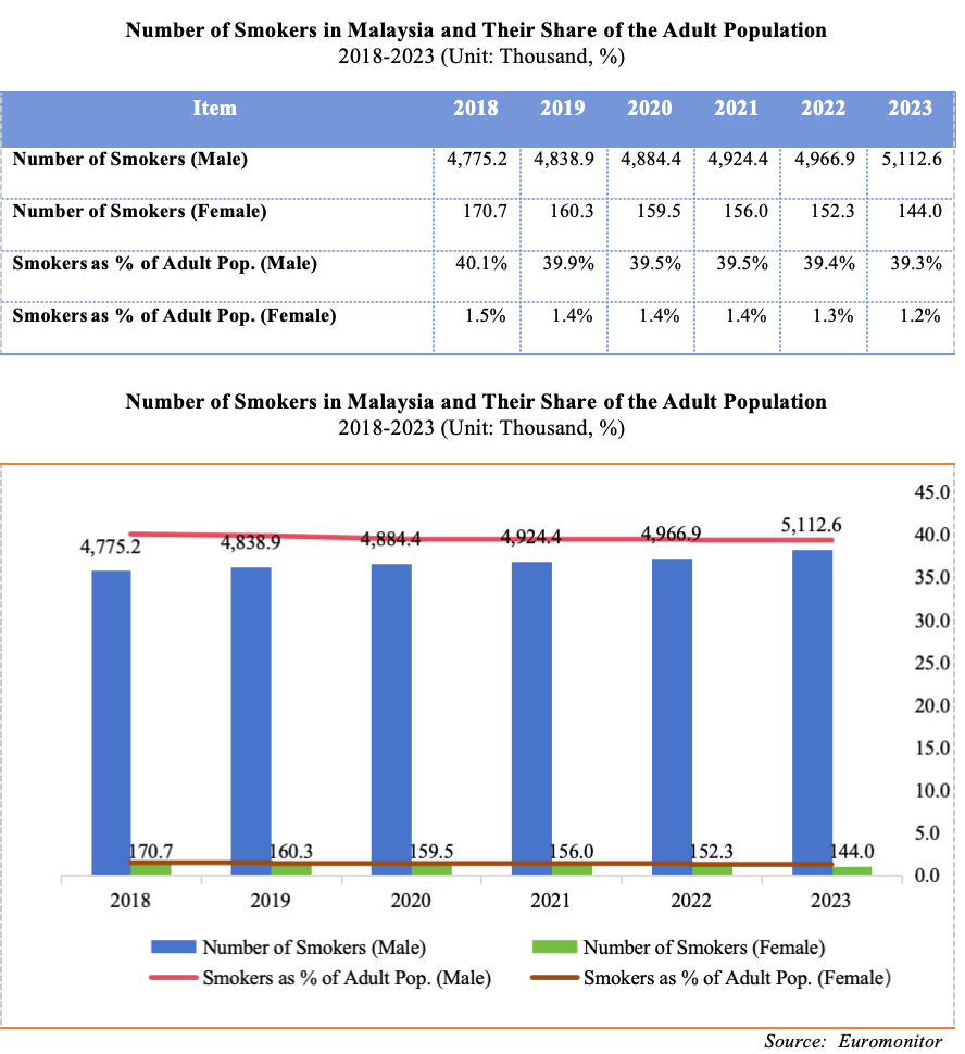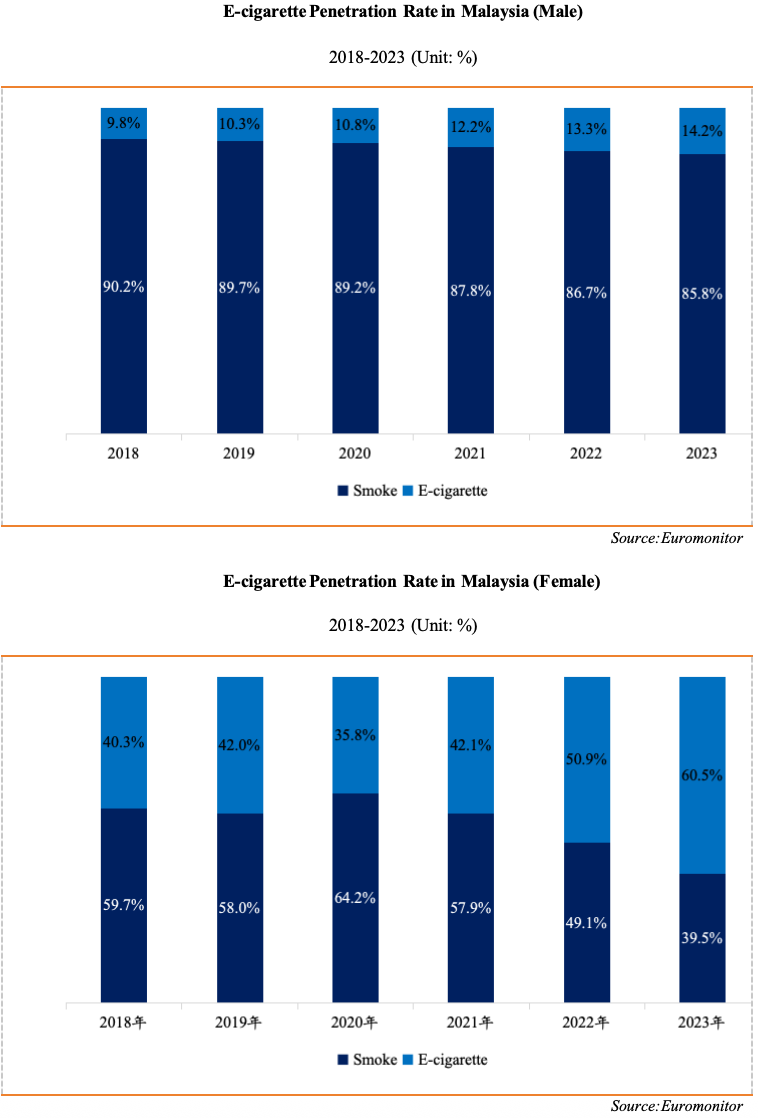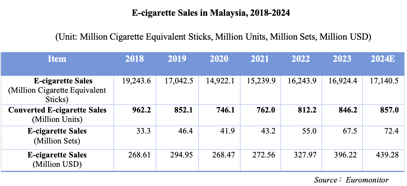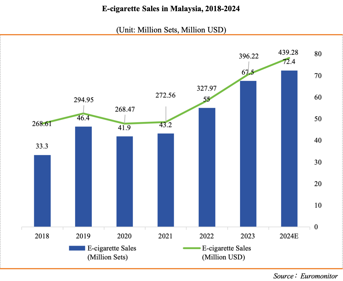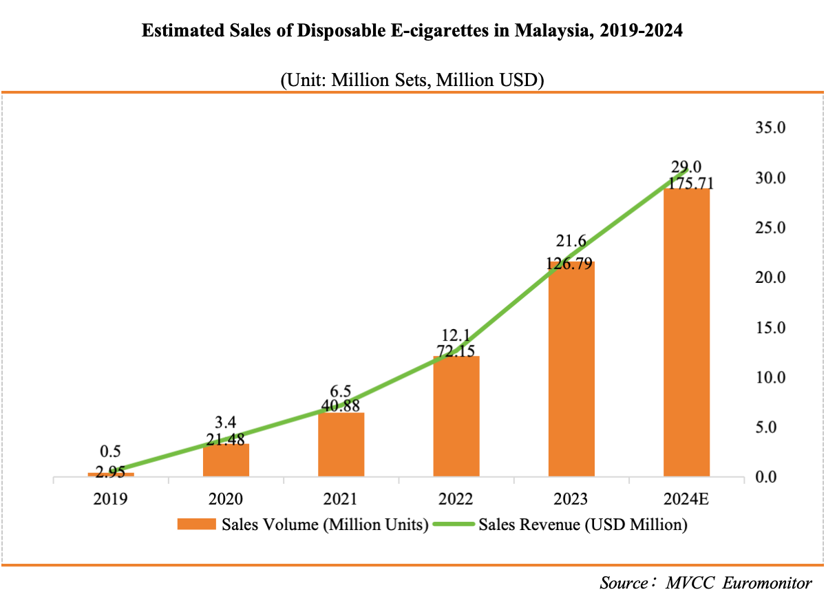Based on calculations from the 2023 Malaysian Vape Industry Study, the sales volume of disposable e-cigarettes in Malaysia reached approximately 21.6 million sets in 2023, with sales revenue of about USD 127 million. In 2024, the sales volume is estimated to be around 29 million sets, with sales revenue projected at approximately USD 176 million.