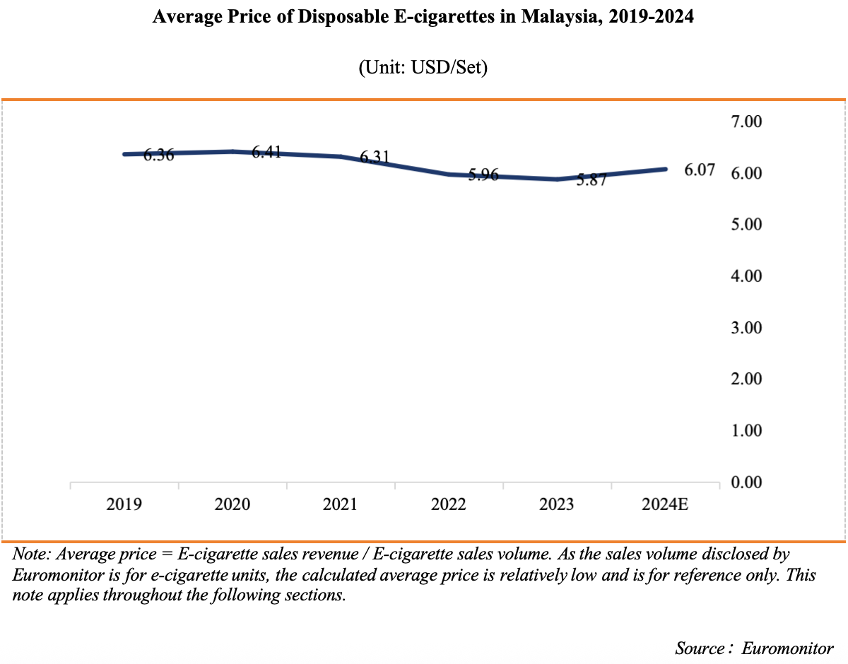 According to Euromonitor data, the average price of disposable e-cigarette products in Malaysia showed a fluctuating downward trend from 2019 to 2023. The average price was USD 6.36 per set in 2019, declining to USD 5.87 per set by 2023, and is estimated to be around USD 6.07 per set in 2024.