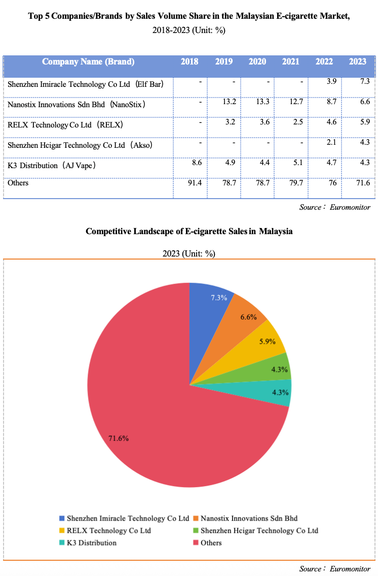 In 2023, Shenzhen Imiracle Technology Co Ltd (Elf Bar) ranked first in the Malaysian e-cigarette market with a 7.3% market share, followed by Nanostix Innovations Sdn Bhd (NanoStix) with 6.6%, and RELX Technology Co Ltd (RELX) with 5.9%. The market shares of other companies/brands were each below 5%. Overall, the concentration of the Malaysian e-cigarette market is relatively low.
