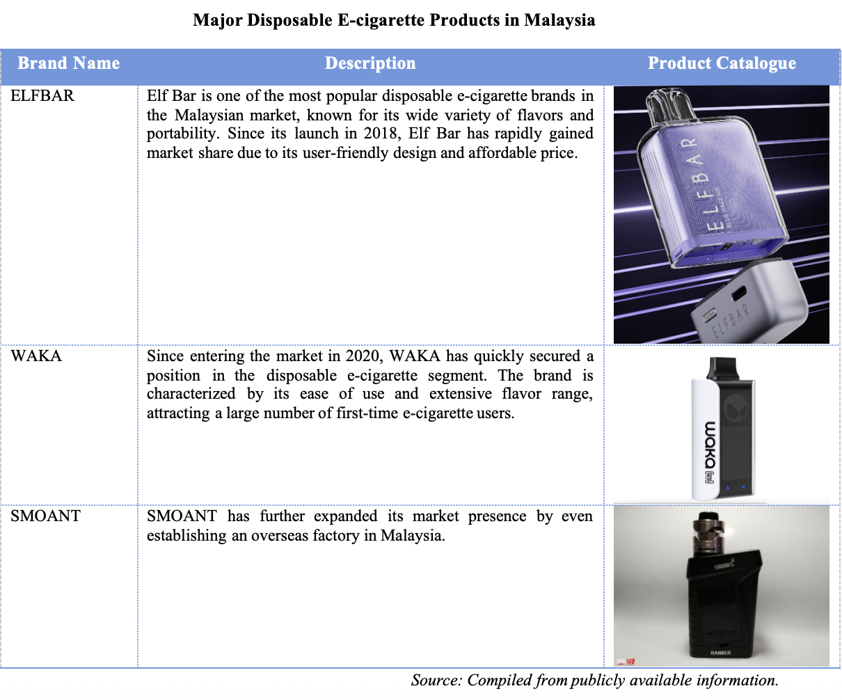 In the Malaysian disposable e-cigarette market, leading brands such as Elf Bar and WAKA have attracted a large number of consumers with their portability and affordability, becoming significant components of the market.