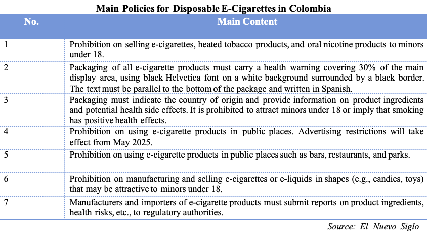 On May 9, 2024, Colombian President Gustavo Petro signed "Anti-Tobacco Law 2.0," bringing e-cigarettes, heated tobacco products, and oral nicotine products under regulatory scope. Through the "Anti-Tobacco Law 2.0," comprehensive regulations on e-cigarette products were implemented, specifying age restrictions, health warnings, labeling requirements, advertising restrictions, and tax policies. These measures aim to protect public health, particularly the health of minors, and reduce potential health risks associated with e-cigarettes.