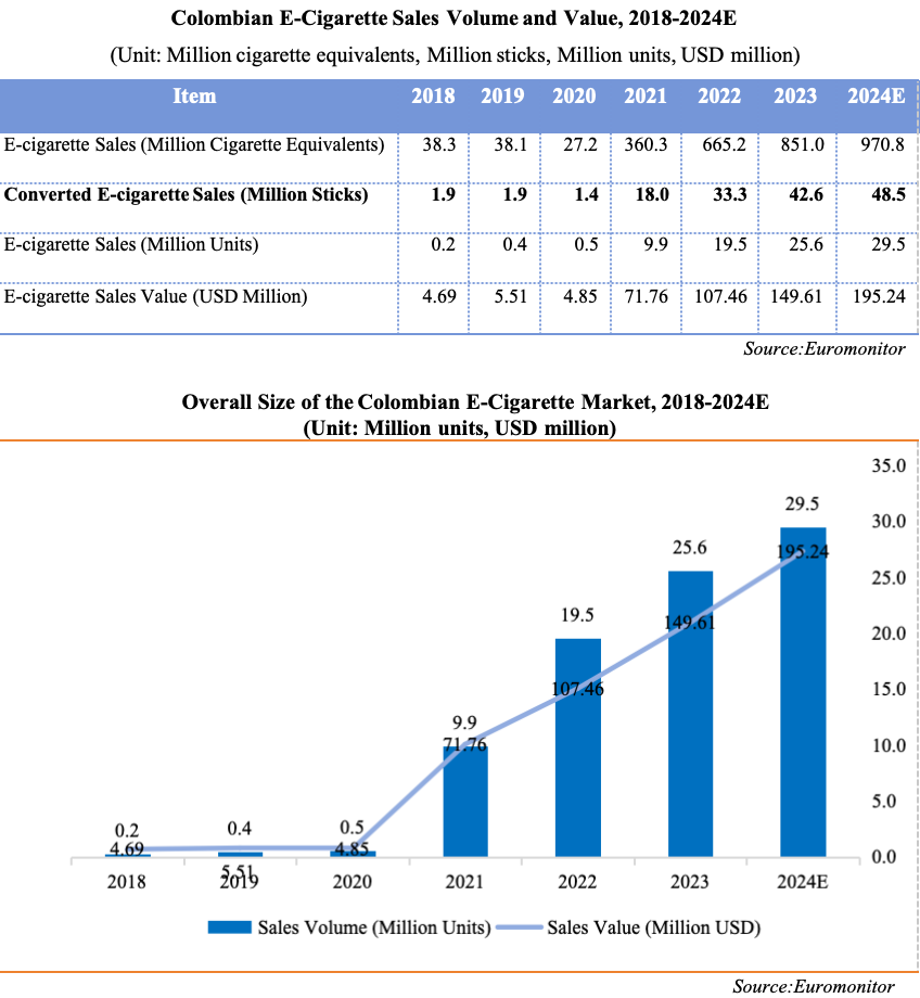 According to Euromonitor data, since 2021, e-cigarettes have rapidly captured the Colombian market. By 2023, Colombian e-cigarette sales reached 42.6 million sticks / 25.6 million units, with a sales value of USD 150 million. In 2024, Colombian e-cigarette sales are projected to reach 48.5 million sticks / 29.5 million units, with a sales value of USD 195 million, showing very rapid growth.