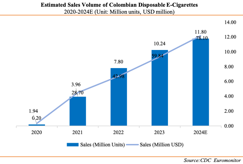 Currently, there is no publicly available detailed data on the proportion of the disposable e-cigarette segment in Colombia. However, it can be inferred that disposable e-cigarettes also account for a significant portion of the Colombian e-cigarette market. Currently, disposable e-cigarettes account for nearly 40% of the global e-cigarette market. Based on this data, it is estimated that in 2023, Colombian disposable e-cigarette sales volume was approximately 10.24 million units, with a sales value of approximately USD 59.84 million; in 2024, Colombian disposable e-cigarette sales volume is estimated at approximately 11.80 million units, with a sales value of approximately USD 78.10 million.