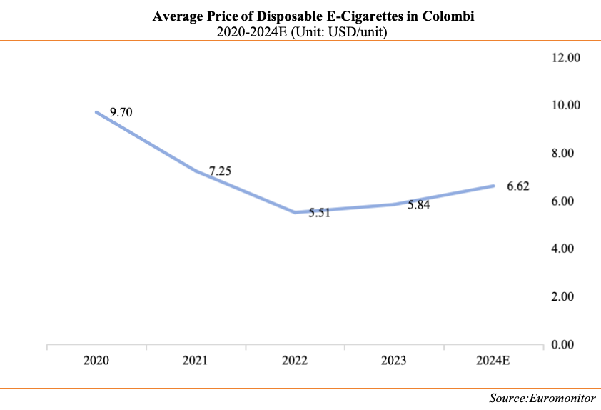 According to Euromonitor data, the average price of disposable e-cigarette products in Colombia fluctuated downward from 2020 to 2024. In 2020, the average price of disposable e-cigarette products in Colombia was USD 9.70 per unit, dropping to USD 5.84 per unit in 2023, and approximately USD 6.62 per unit in 2024.