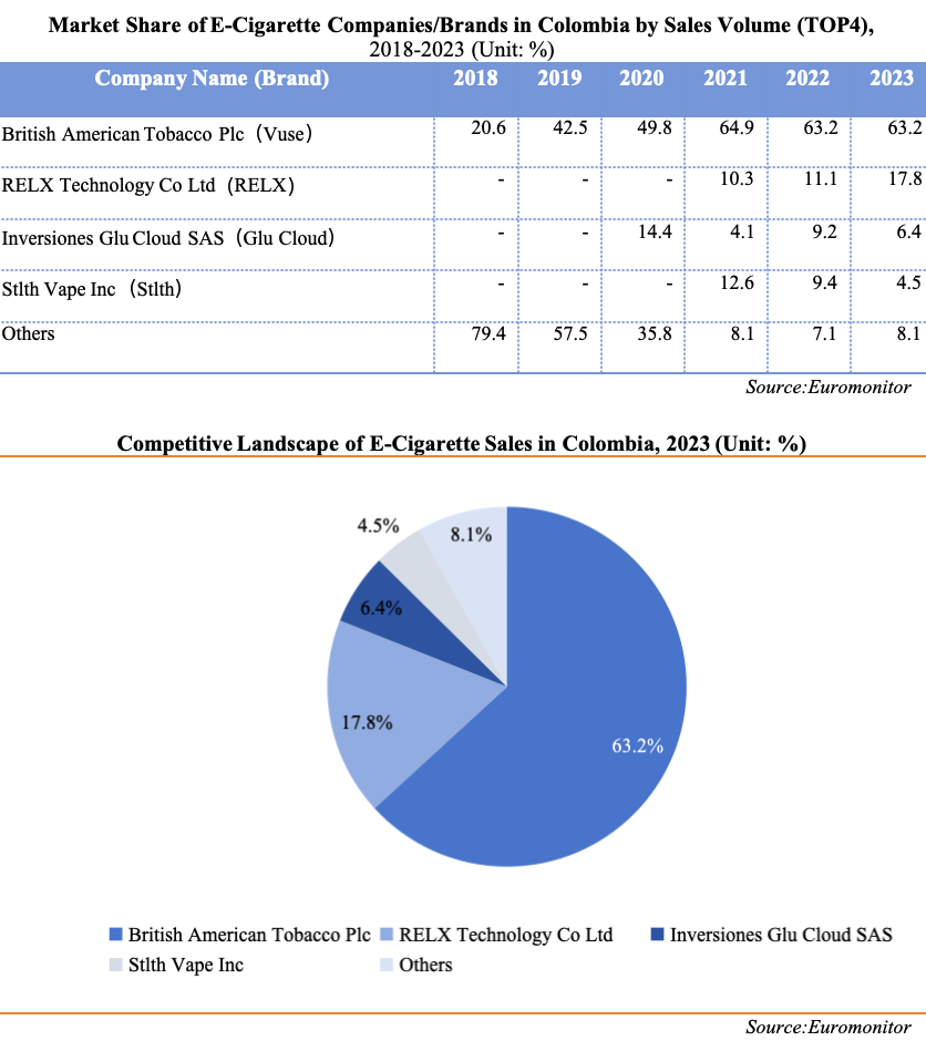 In 2023, within the Colombian e-cigarette market, British American Tobacco Plc (Vuse) ranked first with a market share of 63.2%, followed by RELX Technology Co Ltd (RELX) with a market share of 17.8%. Inversiones Glu Cloud SAS (Glu Cloud) held a 6.4% share. Other companies/brands each held less than 5% market share. Overall, the Colombian e-cigarette market is highly concentrated.