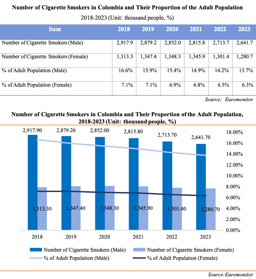 On the consumer side, according to Euromonitor data, in 2023, there were approximately 2.6417 million male cigarette smokers in Colombia, accounting for 13.7% of the adult population. Female cigarette smokers numbered approximately 1.2807 million, accounting for 6.3% of the adult population. Overall, the number of smokers in Colombia has shown a downward trend year by year.