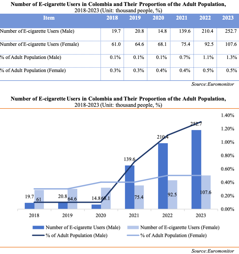 Regarding e-cigarettes, according to Euromonitor data, in 2023, there were approximately 253,000 male e-cigarette users in Colombia, accounting for 1.3% of the adult population. Female e-cigarette users numbered over 107,000, accounting for 0.5% of the adult population. Overall, the number of e-cigarette consumers in Colombia is not high, but the absolute number is growing rapidly, indicating good market potential for the future.