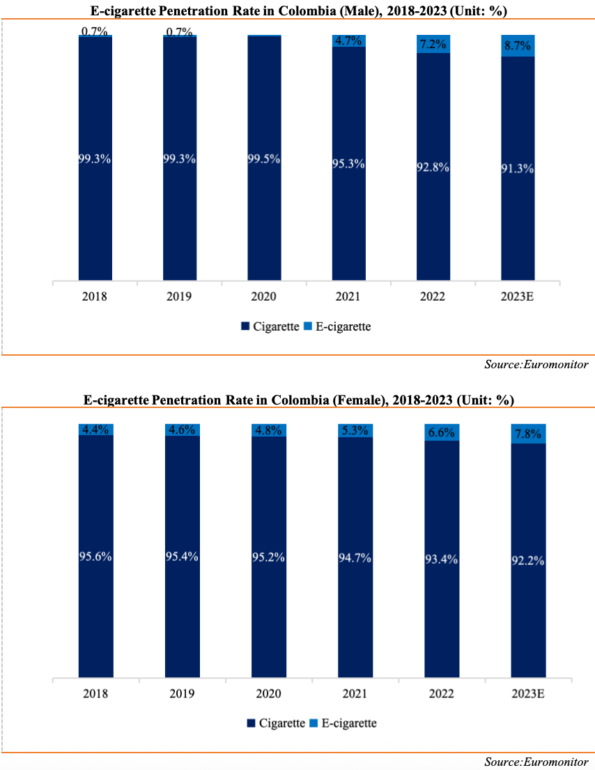 From 2018 to 2023, the proportion of e-cigarette consumers among total smokers in Colombia was relatively low, but this proportion has grown rapidly in recent years. In 2023, male e-cigarette consumers accounted for 8.7% of all male smokers. In the female market, female e-cigarette consumers accounted for 7.8% of female smokers. Therefore, there is significant market space for e-cigarettes in Colombia.