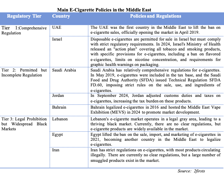 Tier 3: Countries where e-cigarettes are legally prohibited, but weak enforcement has led to widespread black markets, such as Egypt, Lebanon, Iran, and Qatar.