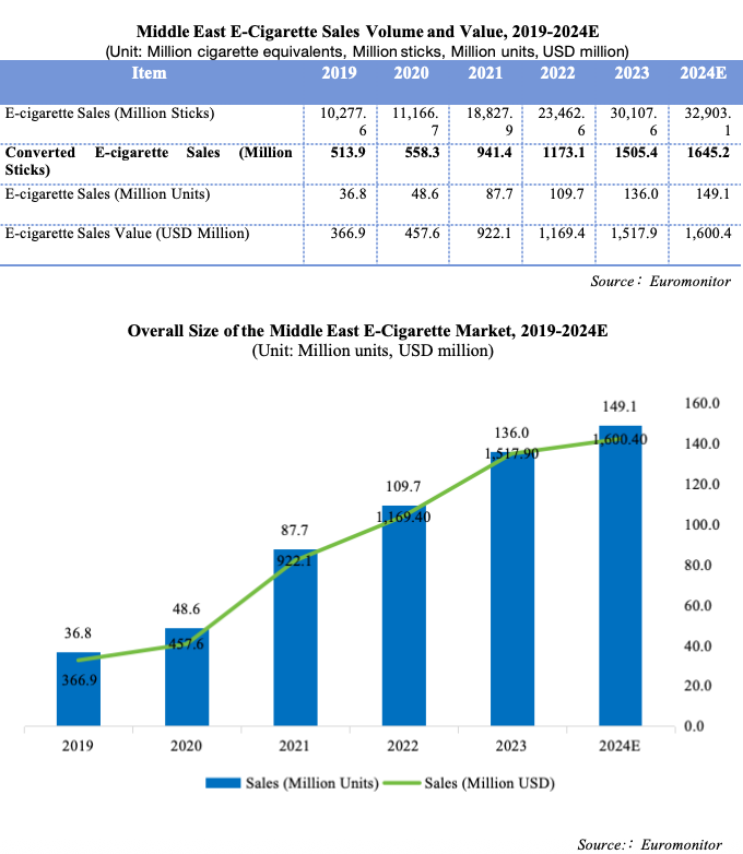 According to Euromonitor data, the Middle East e-cigarette market showed a growth trend from 2019 to 2024. In 2023, sales of e-cigarette products in the Middle East reached 1.505 billion sticks / 136 million units, with a sales value of USD 1.518 billion.