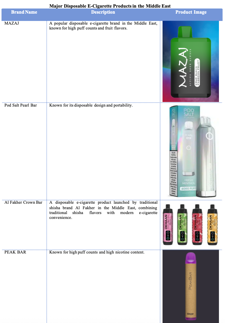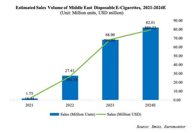 Based on the above data, it is estimated that in 2023, disposable e-cigarette sales in the Middle East reached approximately 68 million units, with a sales value of approximately USD 759 million. In 2024, disposable e-cigarette sales are estimated at approximately 82.01 million units, with a sales value of approximately USD 880 million.