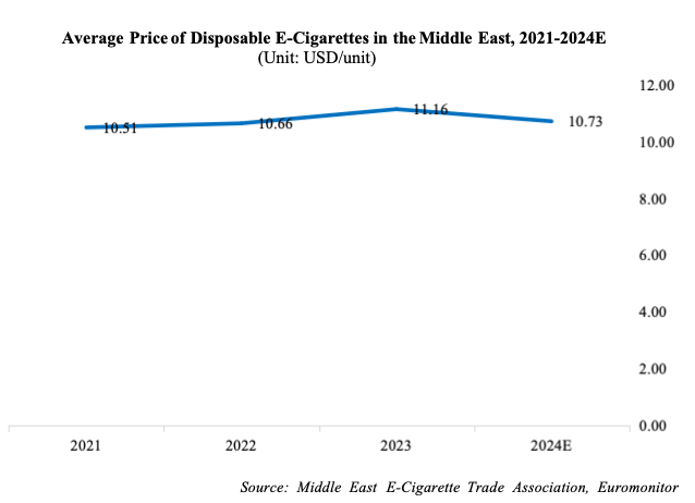 According to data from Euromonitor and the Middle East E-Cigarette Trade Association, the average price of disposable e-cigarette products in the Middle East remained relatively stable from 2021 to 2024. In 2021, the average price was USD 10.51 per unit, rising to USD 11.16 per unit in 2023, and then slightly decreasing to approximately USD 10.73 per unit in 2024.