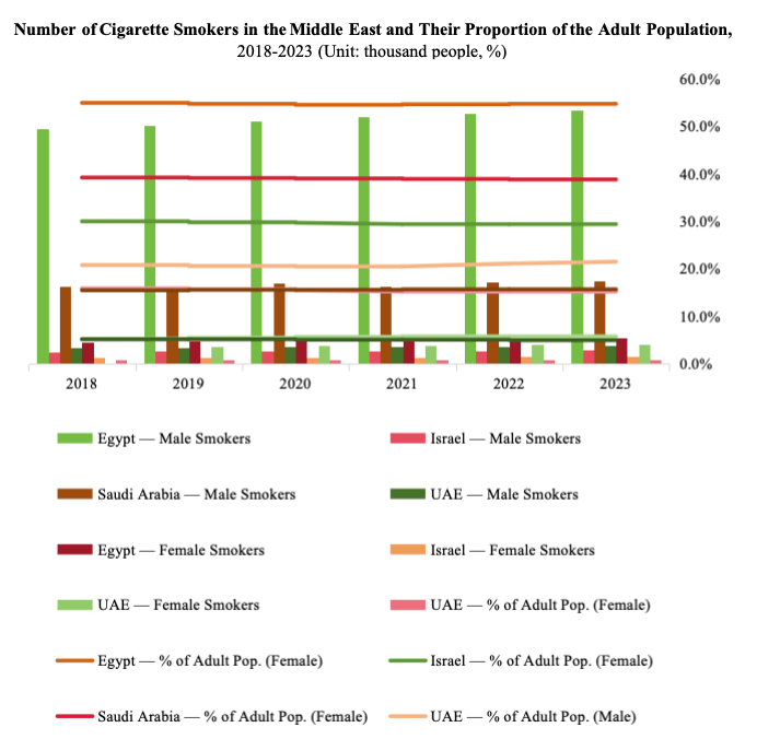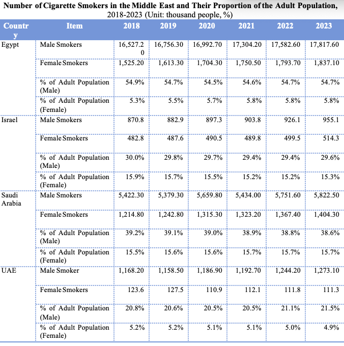 On the consumer side, according to Euromonitor data, among four major Middle Eastern countries in 2023, Egypt had the highest number of male cigarette smokers, approximately 17.818 million, accounting for 54.7% of the adult male population. Female cigarette smokers numbered over 1.837 million, accounting for 5.8% of the adult female population. Overall, the proportion of smokers in the Middle East population is relatively high, with male smokers predominating.
