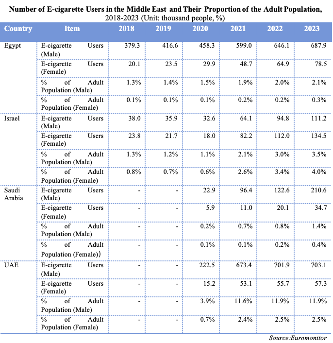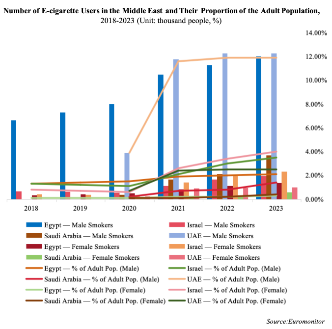 Regarding e-cigarette consumers, according to Euromonitor data, among four major Middle Eastern countries in 2023, the UAE had the highest number of male e-cigarette users, approximately 703,100, accounting for 11.9% of the adult male population. Israel had the highest number of female e-cigarette users, at 134,500, accounting for 4.0% of the adult female population. Overall, the number of e-cigarette consumers in the Middle East is not high, but growth is relatively rapid.