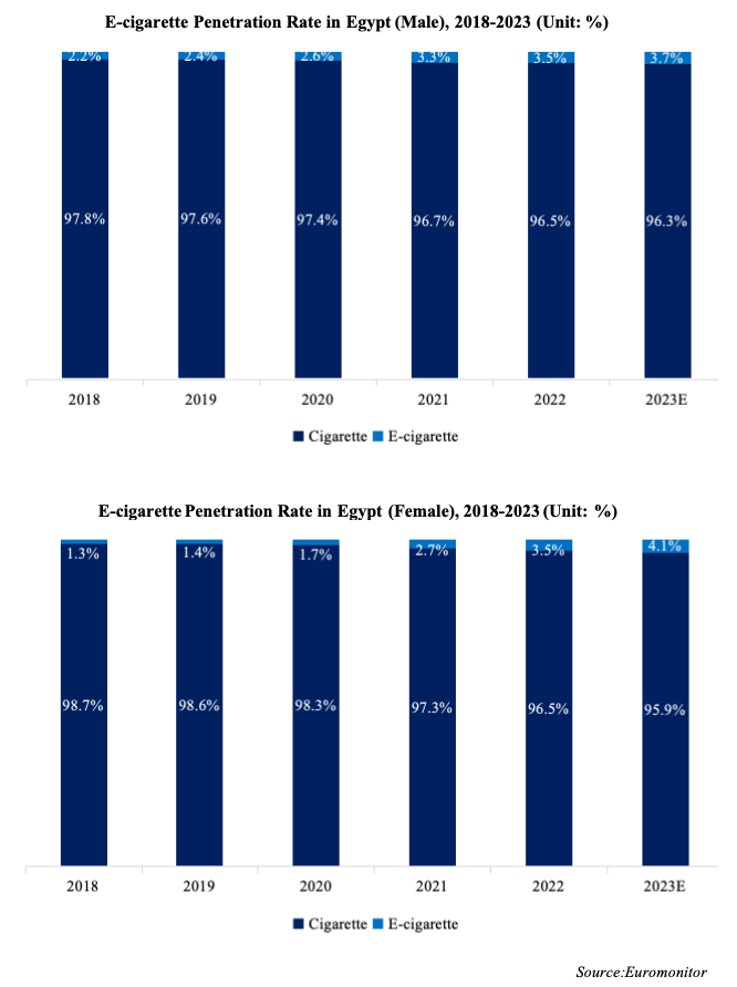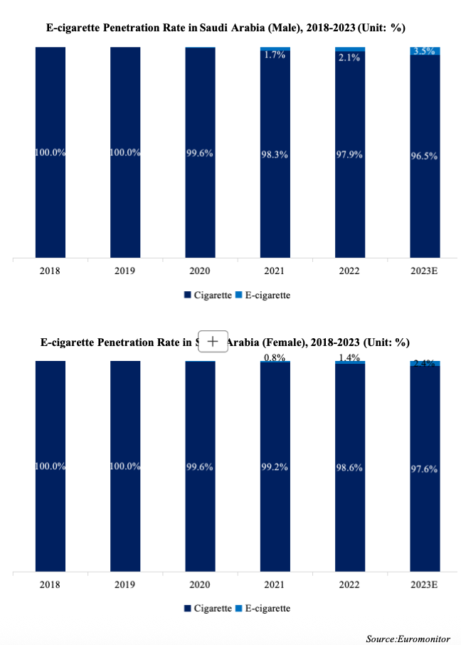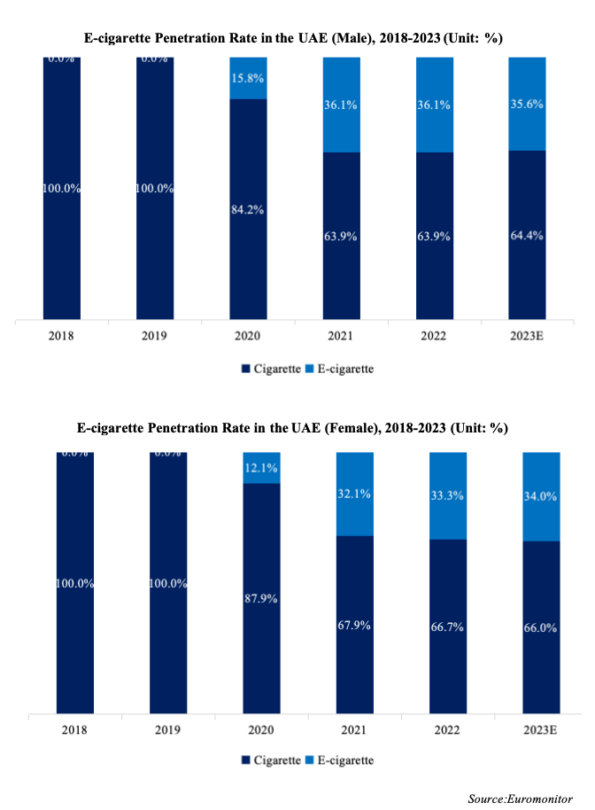 The situation in the UAE market is completely different from that of Saudi Arabia. Since e-cigarettes entered the market in 2020, they have become popular across the UAE. In 2023, male e-cigarette consumers accounted for 35.6% of male smokers, while female e-cigarette consumers accounted for 34.0% of female smokers.