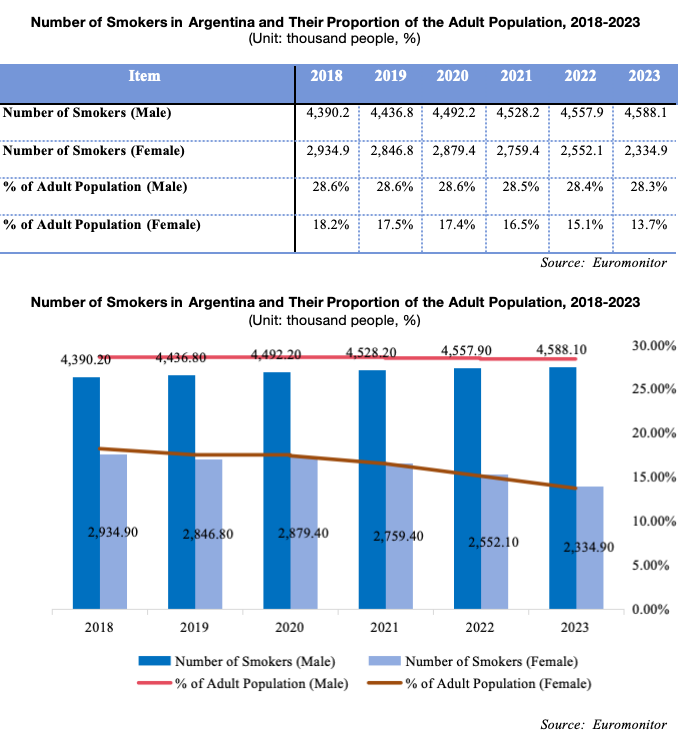 According to data from Euromonitor, in 2023, there were approximately 4.5881 million male smokers in Argentina, accounting for 28.3% of the adult male population, and over 2.3349 million female smokers, accounting for 13.7% of the adult female population. Overall, the proportion of smokers in Argentina's population is relatively high.