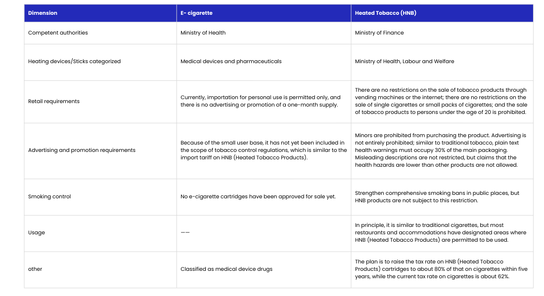 In Japan, heated tobacco products (HNB) are primarily regulated by the Ministry of Finance and the Ministry of Health, Labour and Welfare. HNB is considered a tobacco product and is called heated cigarette (たばこ). The Tobacco Business Act regulates the use of heated cigarettes. The Tobacco Tax Law was revised in 2008, establishing a new category of "heated cigarettes." Currently, there are no specific ingredient restrictions for this type of tobacco product, but there are restrictions on warning labels, which are currently plain text. Cigarettes must display nicotine and tar content on the packaging. HNB sales in Japan require a license from the Ministry of Finance. Japan revised the Health Promotion Law, strengthening comprehensive smoking bans in public places, but HNB products are not subject to these restrictions. In terms of sales channels, online, vending machines, convenience stores, and specialty stores are permitted. The law does not prohibit any form of tobacco advertising, promotion, or sponsorship. Heated tobacco products in Japan must display nicotine and tar content on the packaging. Battery-powered devices also require PSE certification. The following are the regulatory differences between HNB and e-cigarettes.