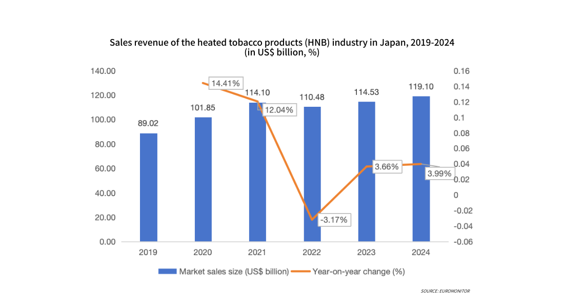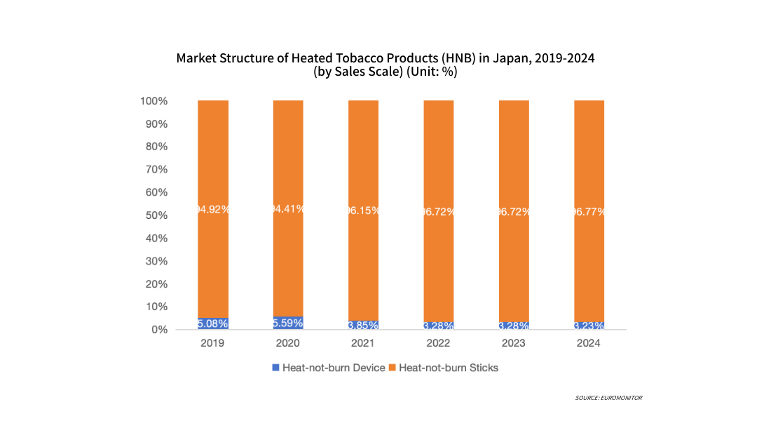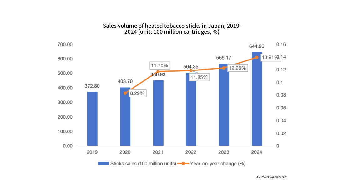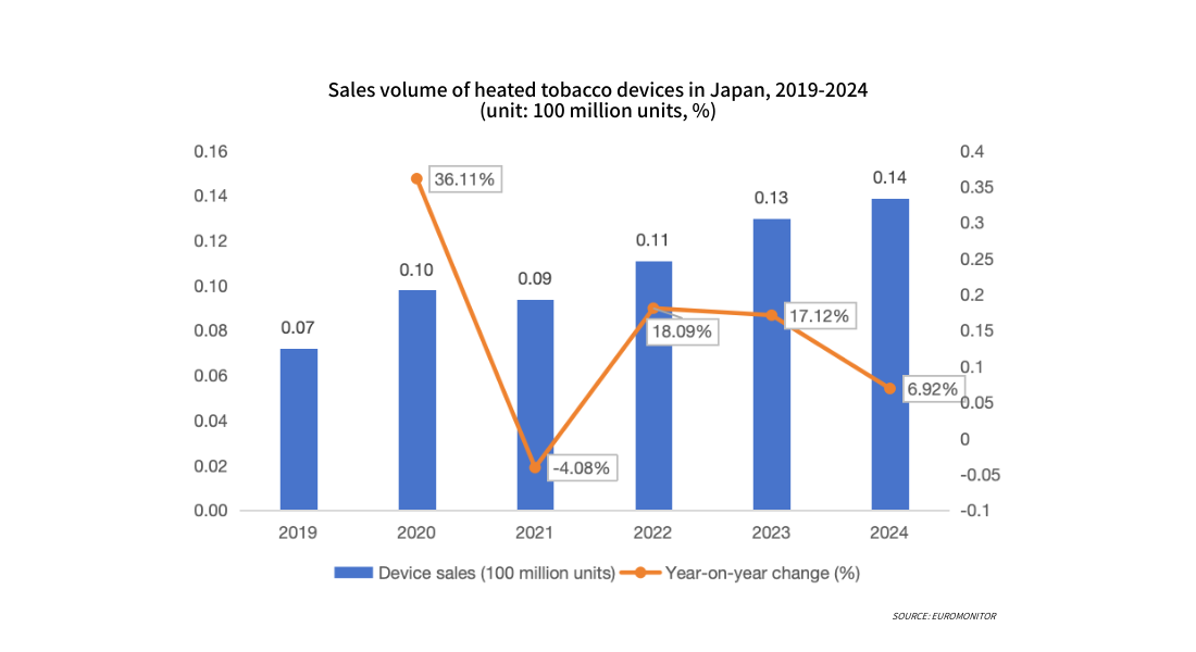 From 2019 to 2024, sales of heated tobacco devices in Japan showed an overall upward trend. Early growth was primarily driven by product iterations and promotions, while the mid-term saw slight fluctuations due to market adjustments. In 2024, device sales reached approximately 14 million units, with the growth rate stabilizing. Rising penetration rates coupled with a slowdown in new user acquisition meant that sales growth stemmed more from replacement demand from existing users than from the expansion of new users, indicating that the market has gradually entered an operational phase centered on repeat purchases of tobacco cartridges.