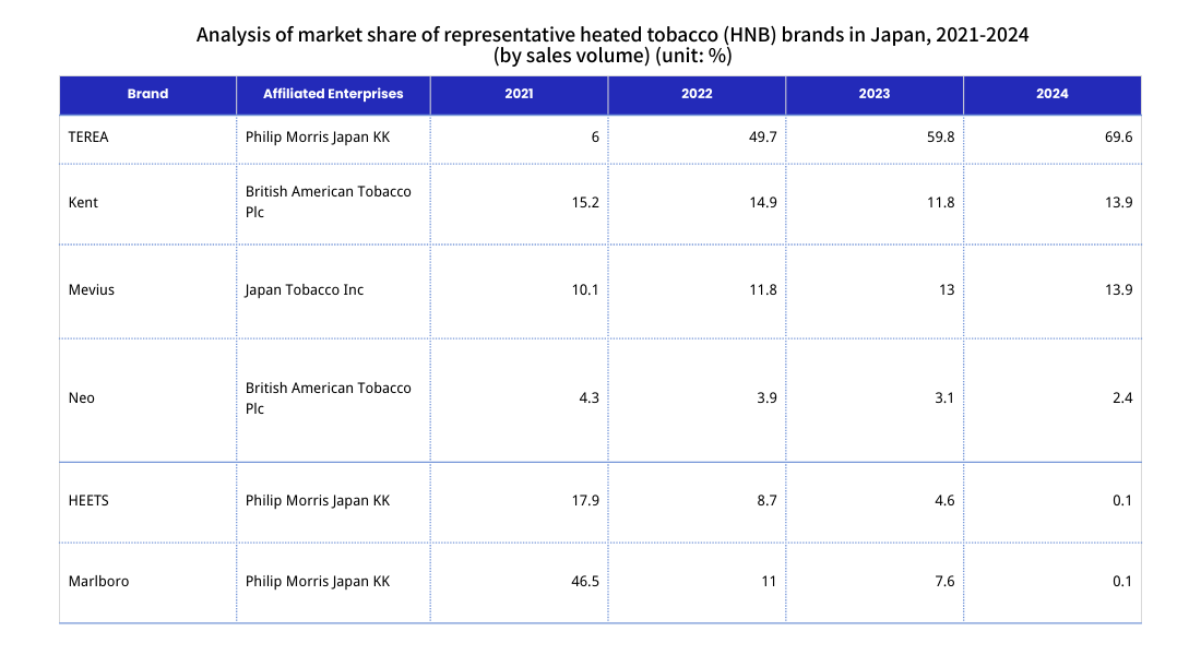 From 2019 to 2024, the structure of the Japanese tobacco product market underwent significant adjustments, with the proportion of traditional cigarettes continuously declining and heated tobacco products (HNB) becoming the main substitute. Driven by policy support (such as Japan's Health Promotion Law allowing its indoor use in specific locations) and product positioning, HNB's market share has steadily increased, gradually approaching the level of traditional cigarettes. Overall, HNB is becoming a significant force driving the evolution of the Japanese tobacco market structure. In 2024, heated tobacco products accounted for 43.51% of all tobacco products in Japan.