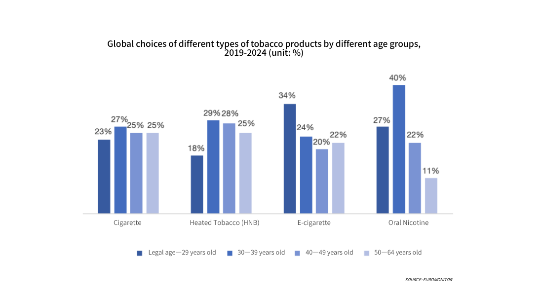 The choices and needs of different age groups regarding tobacco products are highly correlated. According to PMI data, the legal age group up to 29 years old prefers e-cigarettes, accounting for 34% of the total. This is mainly due to the diverse flavors and trendy designs of e-cigarettes, catering to the individualistic and social needs of young people. The 30-39 age group represents a diverse group with concentrated needs, preferring the convenience and smokelessness of pipe tobacco while also appreciating the harm-reduction attributes of HNB (Heated Tobacco Products), balancing workplace and health requirements. The 40-49 age group shows a balanced acceptance of both HNB and traditional cigarettes, placing greater emphasis on the balance between flavor reproduction and harm reduction, and exhibiting a decreased dependence on traditional products. While cigarettes remain the primary choice for the 50-64 age group, 25% of them choose HNB products, indicating a gradual shift towards harm-reduction products driven by health awareness. Looking at HNB, the main age group remains 30-49 years old. Consumers in this age group have increased health awareness, seeking both harm-reduction attributes and flavor reproduction, with a clear demand for alternatives to traditional cigarettes. Simultaneously, their purchasing power is stable, and they have a high acceptance of technologically advanced tobacco products, making them the main force in the HNB market.