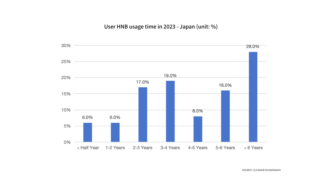 A 2023 survey conducted by CleanAir Scandinavia Co., Ltd., a Japanese company, of 300 consumers who used heated tobacco products (HNB). The survey revealed a continuous increase in the number of people using HNB without burning tobacco in recent years. Some are considering giving up traditional cigarettes, and approximately 60% of respondents have smoked for over 10 years. The growing popularity of HNB has led many to quit smoking, and most HNB users are former cigarette smokers.