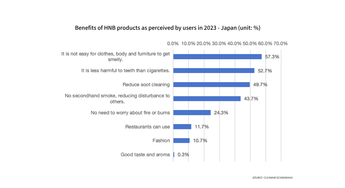 According to the evaluation of the benefits of HNB, 57.3% of respondents believed that the biggest benefit was that it doesn't easily leave behind the unpleasant smell of cigarette smoke; secondly, 52.7% of respondents said it was less harmful to teeth compared to cigarettes; and 49.7% of respondents said it reduced the hassle of cleaning up cigarette ash. These are the top three biggest benefits that attract Japanese consumers to HNB. In addition, 43.7% of respondents believed that HNB does not produce secondhand smoke, reducing disturbance to others; 24.3% believed that there was no need to worry about fire or burns; and 11.7% of respondents believed that HNB can be used in restaurants, which is relatively convenient. However, only 10.7% of respondents thought it was relatively stylish and cool. The survey results show that reducing odor, protecting teeth, and maintaining hygiene are the main reasons why most people choose HNB products.