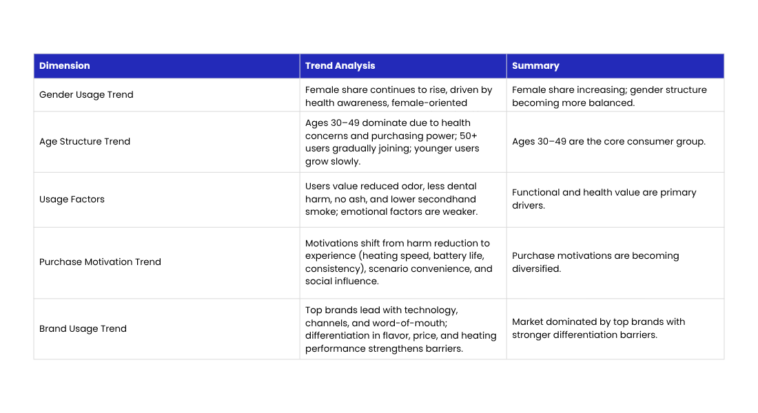 Since the advent of heated tobacco products (HNB) as an alternative to traditional cigarettes, their market share has increased year by year. Many people choose to switch from traditional cigarettes to HNB because HNB has many advantages, such as less odor, less tar buildup, and no secondhand smoke. However, dedicated devices also have some obvious drawbacks, such as the inability to smoke after the battery runs out and the hassle of cleaning. In terms of consumption trends, the gender usage trend of HNB shows a steady increase in the proportion of female users and a trend towards a more balanced gender structure. The 30-49 age group is the main consumer group. The choice of HNB usage is highly driven by both practical functions and health value, with emotional factors having a weaker influence. Consumers' purchasing motivations are evolving from a single focus on harm reduction to a multi-faceted approach considering health, experience, and scenarios. Finally, in terms of brand usage trends, the trend will show a dominance of leading brands and the creation of barriers through differentiated advantages.